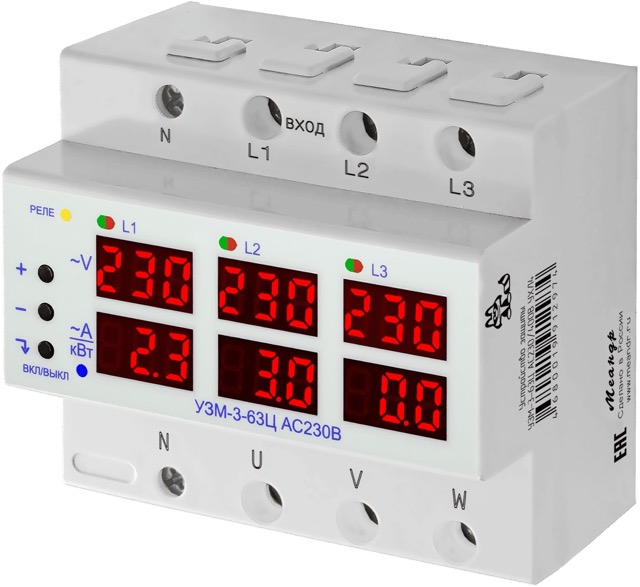 Реле напряжения с контролем тока 3P+N KARAT, 3НО, 63А, 220В AC