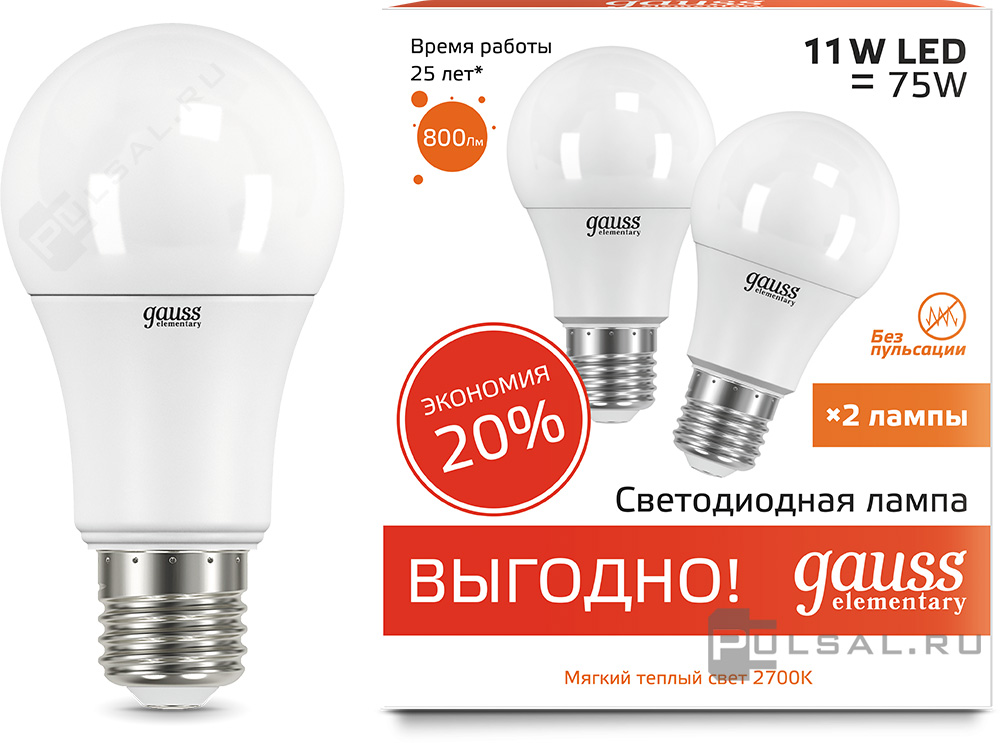 Лампа (2 лампы в упаковке) светодиодная Elementary, цоколь - E27, мощность - 11Вт, световой поток - 800Лм, цветовая температура - 2700Кцветовая температура - 3000К, не диммируется, 23211P, Gauss