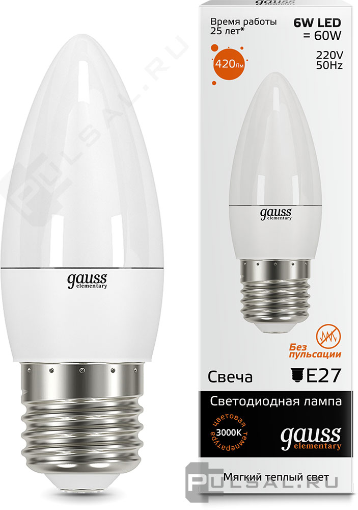 Elementary, цоколь - E27, мощность - 8Вт, световой поток - 520Лм, цветовая температура - 3000К, не диммируется, 33218, Gauss