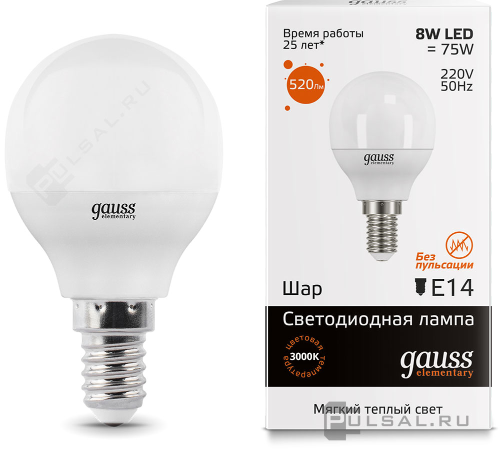 Лампа светодиодная Elementary, цоколь - E14, мощность - 8Вт, световой поток - 520Лм, цветовая температура - 3000К, не диммируется, 53118, Gauss