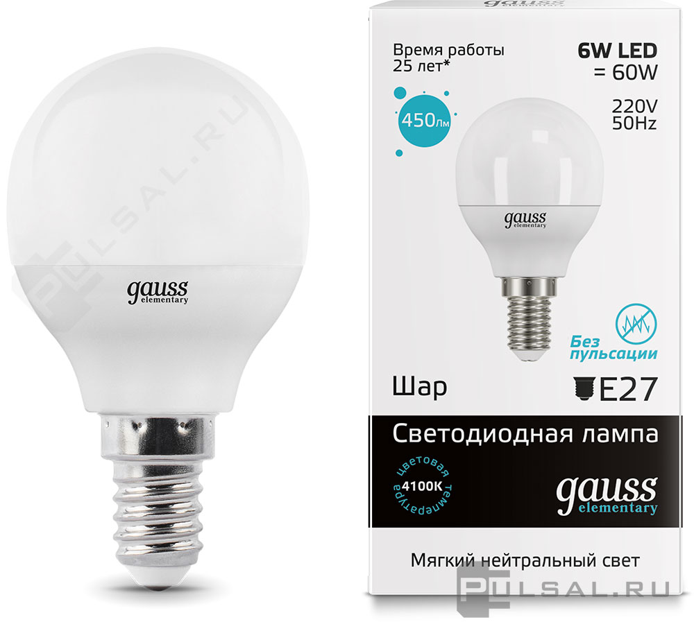 Elementary, цоколь - E14, мощность - 6Вт, световой поток - 450Лм, цветовая температура - 4100К, не диммируется, 34126, Gauss