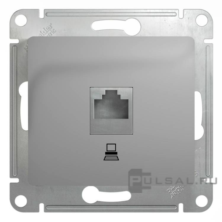 Розетка Glossa, со шторками, с заземлением, одинарная, винтовые клеммы, цвет - алюминий