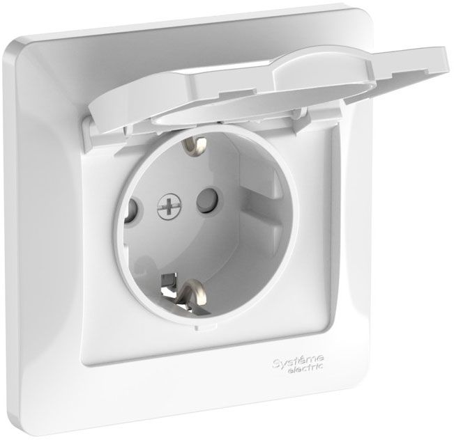 Розетка-моноблок (безвинтовые клеммы) Glossa, со шторками, с крышкой, с заземлением, одинарная, безвинтовые клеммы, цвет - белый