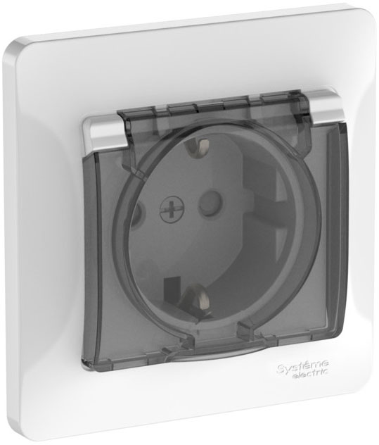 Розетка-моноблок (безвинтовые клеммы) Glossa, со шторками, с крышкой, с заземлением, одинарная, безвинтовые клеммы, цвет - белый