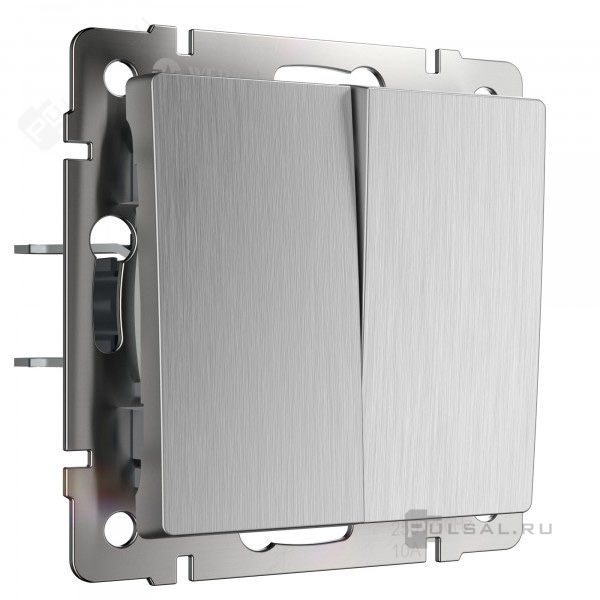 Переключатель Alumax, Split, Slab, Senso, Baguette, Acrylic, Platinum, Elite, Snabb, Stream, Flock, Stark, Fiore, Favorit, Diamant, Aluminium, Antik, Metallic, двухклавишный, с подсветкой, цвет - серебряный рифленый