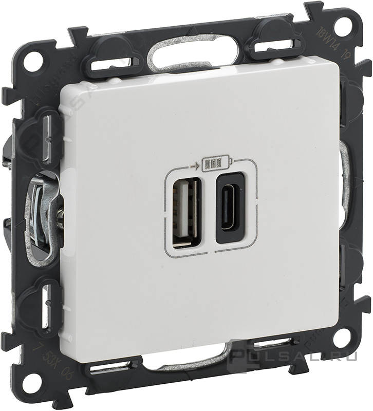 Розетка USB type-C + type-A, 3.0А Valena Life, USB type-C 5V, USB type-A 5V, двойная, цвет - белый