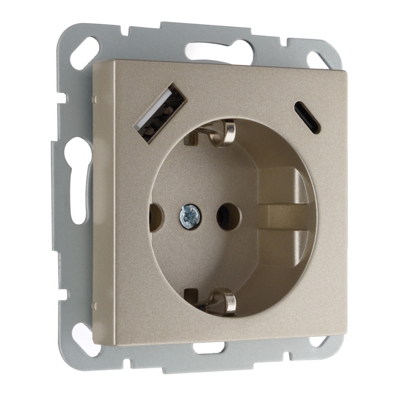Розетка Epsilon, Retro Liregus, со шторками, с заземлением, одинарная, безвинтовые клеммы, цвет - шампань